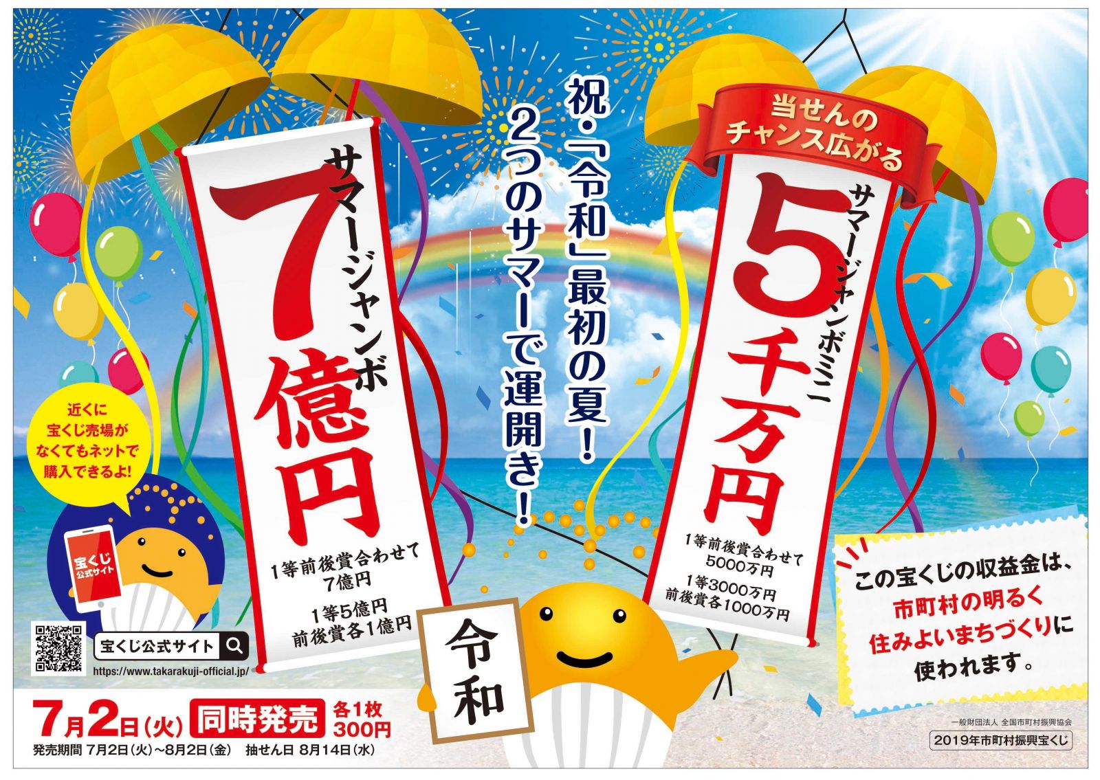 2020年 サマージャンボ宝くじ 販売概要 ■1等 5億円 前後賞合わせて 7億円 ■2等 1,000万円 発売期間 : 2020年7月14日(火)~2020年8月14日(金) 2021年サマージャンボ宝くじ購入結果!【連番バラ1セットと三連バラの合計15,000円で勝負してみた】 2021年8月26日 どうもきんねこです。 今回は2021年サマージャンボ宝くじの購入結果報告をしていきます。 今回のサマー. 同時抽せん サマージャンボ宝くじ(第892回全国) 抽せん日 2021年8月25日(水曜日) 支払い期間 2021年8月30日(月曜日)~ 2022年8月29日(月曜日) 抽せん会場 東京「宝くじドリーム館」(無観客) ※新型コロナ感染拡大防止の為に. 2021年 「サマージャンボ宝くじ」、「サマージャンボミニ宝くじ」の当選番号を記載いたしました。 2021年 サマージャンボ宝くじ 当選番号 等級 当選金額 組 番号 1等 5億円 73組 119326番 1等の前後賞 1億円 1等同組 1等の サマージャンボミニ 第893回全国自治宝くじ 当選番号 等級(当選金) 組/番号 1等 (3,000万円) 89組 127921番 1等 (3,000万円) 05組 193040番 1等 (3,000万円) 94組 124650番 1等 (3,000万円) 80組 161540番 1等の前後賞 (1,000
